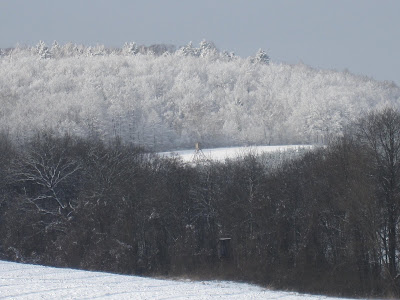 Quite an adventurous walk this morning. Gerit and her lovely big dog Gömbi joined us, and we ended up taking a new route which snaked through the white forest for over an hour and a half. At one point we came upon a small natural water source bubbling from the ground, guarded by a half-circle of twigs and leaves, pictured here. The pool was full of rotting leaves, but once we cleared them out the dogs had a small drink. We also found this intricate, ice covered spider web in the gaping mouth of a tree trunk, surrounded by low plants which Gerit swears are a kind of wild blueberry. We made a point of remembering the spot for summer. Kiki had a wonderful time chasing Gömbi up and down the hillsides while Gerit and I talked about dogs and plants and stuck mainly to the path. At one point, deep in the woods, we noticed a part of the creek was completely frozen over. Supposedly it will get warmer in two days, which means slush and mud, but also means a nose and chin that don't feel like they will fall off any moment. Now Kiki is sleeping, snoring loudly, on the stuffed chair in the living room. I yanked up the heat when we got back so we could thoroughly unthaw. I am sure she will sleep for at least two hours. That's when you know you've taken your dog on a proper walk.