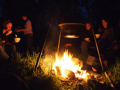 As I looked around at the faces in the firelight, blue smoke rising, soup bubbling, I felt how good it was, how natural, for a group of people to sit around a fire and tell stories and share a meal. We ate the soup, delicious, with trees around us, and moon and stars above. It was beautiful.